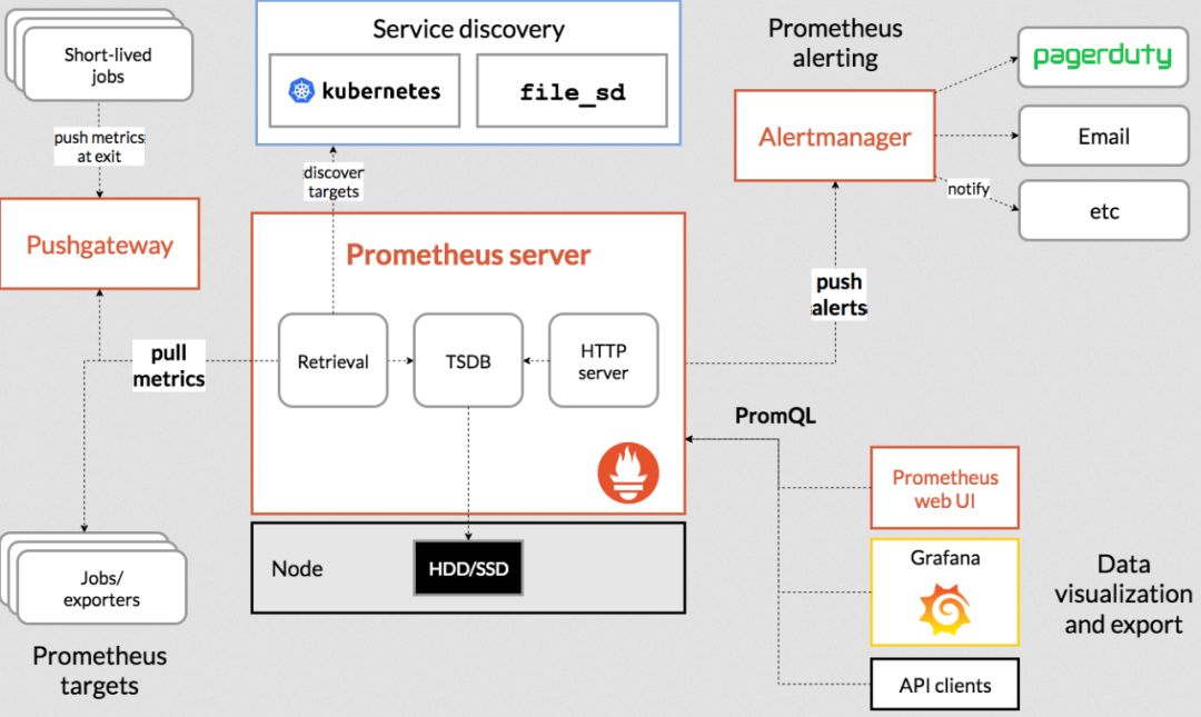 从看图的左下角可以看到,Prometheus 可以通过在应用里进行埋点后Pull到 Prometheus Server里,如果应用不支持埋点,也可以采用exporter方式进行数据采集。