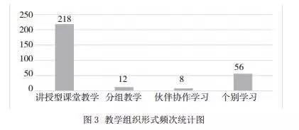 电子书包环境下语文阅读课堂理论上已经具备了学生开展自主学习、合作学习的条件和支持。但从数据分析,发现目前语文阅读课中,教师的讲授式教学还是占主导地位,其次是学生的个别学习,分组教学和伙伴协作学习相对都比较低。教学组织形式频次统计如右图3所示。在信息技术的支持下,教师教学正在探索转向以学生为中心的教学方式,但目前还没留给学生充分的自主权,教师教学组织方式仍受到教师水平、班级人数等原因的限制。但从视频分析中也可以得出,虽然课堂中较少采用了分组教学和伙伴写作学习的形式,但是在讲授型课堂教学中已经有了很多数字化技术的元素。