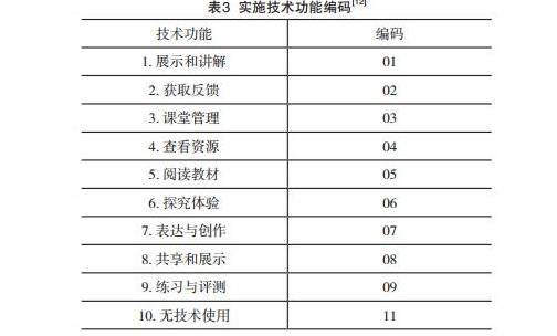 实施条件一般指电子书包课堂教学过程中需要教学工具的支持条件,例如板书、教具、信息技术等。经过视频分析,结合语文阅读课的实施条件,共计有9项具有技术的教学常用功能,并分别为之编码,如表3所示。