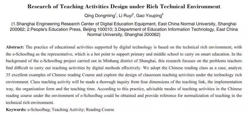 电子书包教学应用已经走过了探索的初级阶段,目前最大的困难在于常态化的应用。如果不能进行常态化的应用,则电子书包所配置的大量设备、资源和精力将面临巨大的浪费。而要开展常态化的教育应用,除了软硬件环境、教学资源等条件外,最大的问题是教师要进行深度、有效的电子书包课堂教学,要学会如何设计课堂教学活动,如何有效利用电子书包带来的技术优势,运用相应的不同于以往传统的新的数字教学活动和教学方法。这就需要我们在微观细节层面,针对具体学科和课型,构建有利于既发挥电子书包的优势,又能实现教学目标的数字化教学活动设计,为教师开展基于技术丰富环境下的常态化教学活动,提供理论和实践的指导,从而推动电子书包在课堂教学中的有效应用。