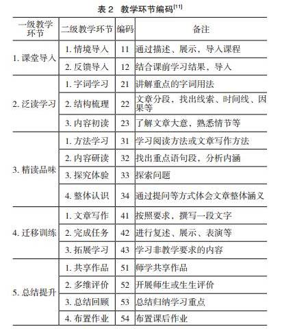 教学环节是指课堂教学过程当中课堂逐步推进的教学流程。本研究主要通过对35节优选的电子书包语文阅读课进行分析和梳理,依据阅读课教学理论环节[10],整理出二级的教学环节编码,如表2所示。通过将教学环节部分的二级分析维度进行了归纳和调整,合并有重叠的维度,剔除未出现、不适用的维度,补充和完善描述不准确的部分,得出基于视频课例的教学环节框架,并进行了编码,如表2所示。例如“12”指教师以反馈导入方式作为课程导入,“21”指以字词学习方式进行泛读学习。