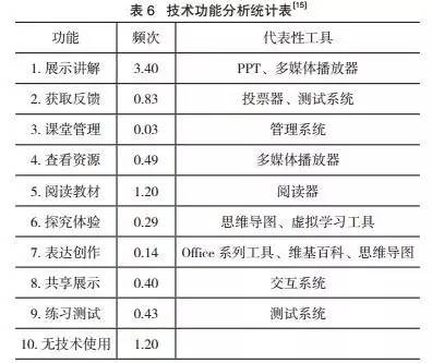 依据视频分析,得出关于技术功能分析统计,如下页表6所示。通过分析可以得知,展示讲解(编码01)是使用频率最高的技术功能,阅读教材(编码05)则位于第二位。这两个技术功能均是具有代替纸质课本功能的作用,同时学习资源的多样性和数字性,通过动画、音视频形式,增加课堂学习的趣味性。通过阅读器等工具所具有的展示和标记等功能,能更好地帮助和支持学生开展有效学习。获取学生反馈功能(编码02)的使用频率比较高,这是电子书包开展教学的最有效功能,可以快速获取学生的学习情况。获取反馈常见的有两种方式:通过投票系统,获取反馈;通过屏幕分享系统,对个别学生答题情况进行屏幕汇聚和分享,从而获取学生的学习情况。这些具有电子书包优势的技术功能,使得课堂反馈效率大幅度提升,促进快速有效的学习效果诊断。结合教学环节的选择,可以发现探究体验(编码06)和共享交流(编码08)的采用频次较高,而表达创造(编码07)的频次较低。这表明在目前技术环境下,直接在数字终端进行快速和大量的书写,用户体验和技术支持还存在一定问题。多数课堂案例先用传统的纸笔书写,然后通过拍照上传分享。