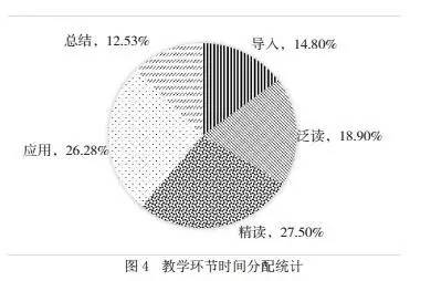 小学一节课的教学时间通常控制在35-45分钟之间,依据视频分析,得出关于教学环节时间分配比例统计,如图4所示。经数据统计,在本研究分析的35节视频课例中,课堂导入环节和总结环节教学时长相对较短,平均分别占总课时的14.80%和12.53%;泛读学习和精读品味环节平均教学时长相加,近占总课时的50%,对于语文阅读课而言符合实际教学的课堂时间安排。特别是对于迁移应用环节,平均占26.28%。由此可推断,在电子书包环境下语文阅读课已经不拘泥于课文的学习,旨在学生运用能力上,根据教学环节中在迁移训练中将设计、共享、评价等多种方式训练学生的高阶思维。