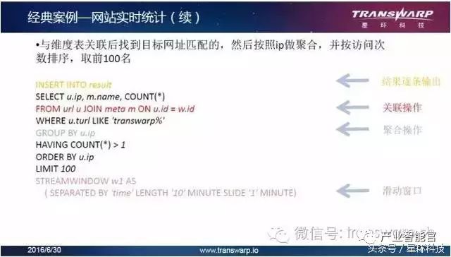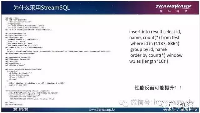 接下来有一个非常直观的例子。左边这部分是用spark streaming 写的代码,这里还不是完整版,完整的需要2页ppt才能展示。如果用SQL写,就只需要右边的这几行代码了。这几行主要就是对test表根据一定的排列方式输出查询结果。这个SQL看上去就比较直观,稍微有点SQL经验的人都可以容易的看懂这些代码。如果让分析人员看左边的代码,那就比较困难了。