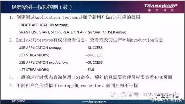 具体来说是这样的,首先要去创建一个testapp,就是create application testapp,然后把相应的权限都赋给Emily。这样做了之后,一般来说到对应的testapp里去查相应的权限是可以查到Emily有权限的,但是她到另外一个生产集群上去做相应的操作,是没办法成功的。另外,我们的List命令是可以查询到一般的运行状态的,比如现在跑了多少task,运行了多长时间,在什么状态,有没有什么问题等等。额外的信息我们是不给普通权限的人开放的,需要有管理员信息才可以到4040页面查看。最后,不同租户之间,例如刚才的testapp和production之间做到彻底隔离互不干扰。