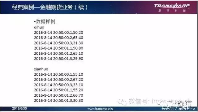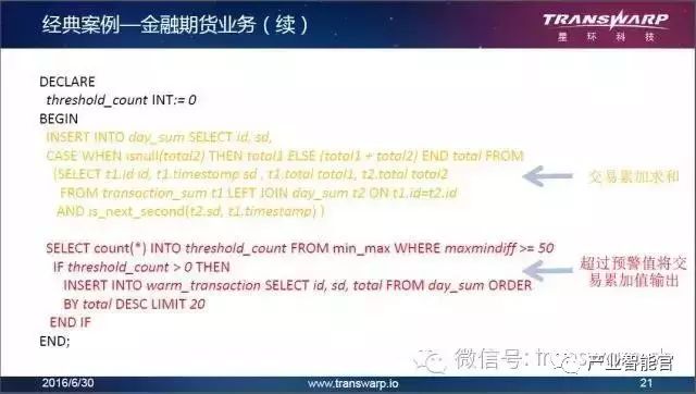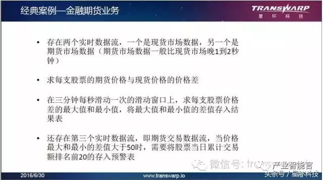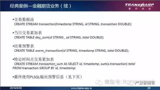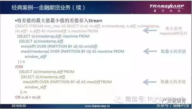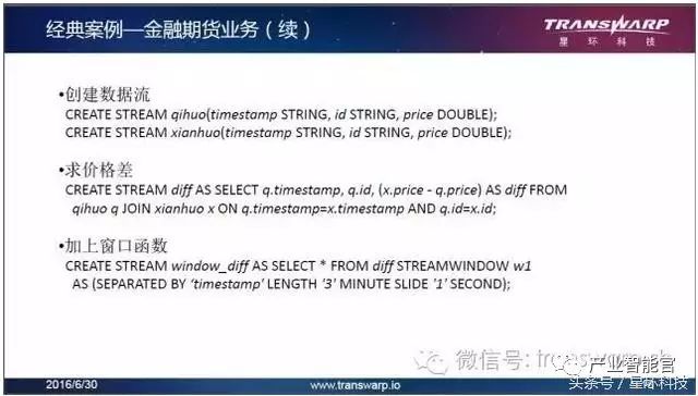 最后一个案例是比较复杂的金融期货的案例。简单来说,整个过程就和刚才差不多,就不断的create一些stream表,不停的在stream表上做一些转化,再加上一些窗口函数,最后就可以实现一些很复杂的业务。