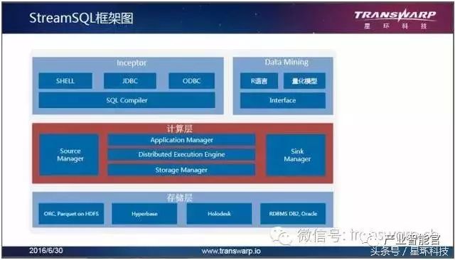 接下来是stream SQL的框架图,分为三层。最下面是存储层,在这一层上,我们的SQL可以对接各种存储层,例如ORC,Hyperbase,holodesk,Oracle等等。