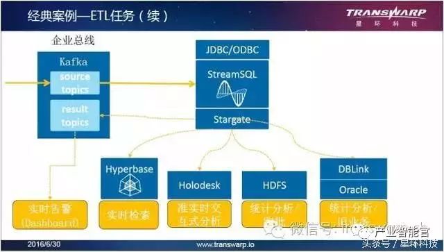 如果有一些实时数据进来,我可能有需求要把他们存储起来,录入到某个库里面,或者后来需要做现场分析,我们要录入holodesk内存表,之后做查询。这就是一个非常常见的ETL任务,无论在什么行业里,当前这个用到的是比较多的。若这个步骤要用编程实现,工作量还是蛮大的,有很多问题需要考虑,接口怎么处理等等。如果是用我们的产品,你可以用过JDBC或者ODBC对接我们的StreamSQL,通过Stargate导到各个不同的数据库里,比如对Hyperbase做一个实时的检索,Holodesk可以做实时的交互分析,HDFS可以做统计分析和跑批等等。我们甚至可以把结果在写回Kafka,给下一个应用做实时告警。