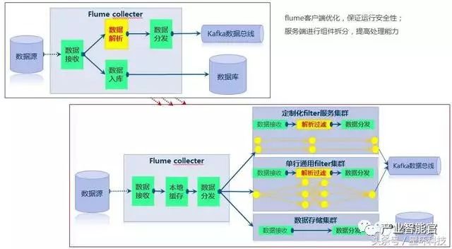 为了解决flume服务端收集数据的性能问题,我们对flume服务端进行微服务化拆分,将原来集中在服务端的接收、解析、入库工作拆分出来,原有的flume服务端用其对loadbalance、failover以及与客户端之间发送接收事务的支持进行数据接收,构建skyline微服务组件集群实现解析和入库的功能,并根据不同级别、不同类型的解析、入库需求分配不同的组件。