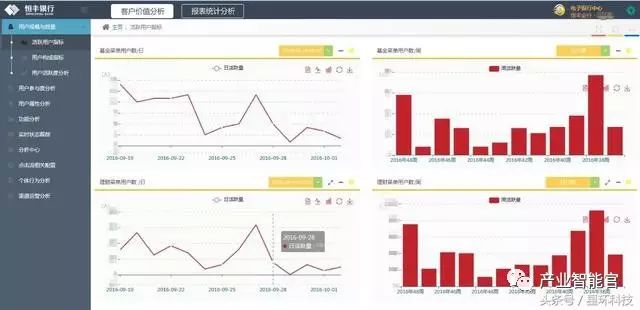 通过分析理财、基金等功能模块的客户活跃指标,观察银行理财偏好客户在全行占比情况,以及理财、基金产品的关注情况,从而更好的了解银行客户的规模和质量。