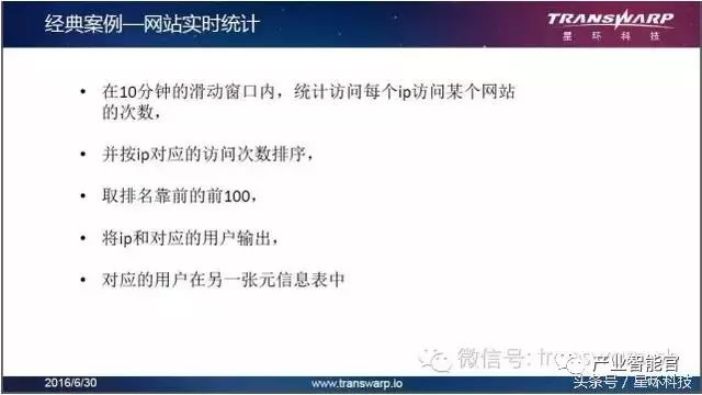 最后因为时间关系,我们就不详细介绍剩下两个案例。第三个是网站实时统计的一个场景,需求我列在ppt里,其实我们也只需要下面这张ppt里的几行SQL就可以解决。