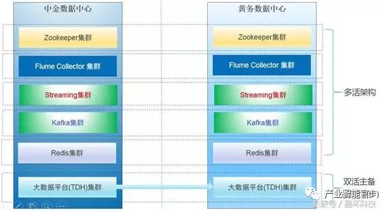 流处理平台使用的主要技术组件及其在两个数据中心部署的架构如上图所示。其中:Zookeeper集群,主要负责配置流处理平台管理和任务队列管理功能;Flume Collector集群,主要负责流处理平台文件类数据的接入工作;Streaming集群,为流处理平台的核心组件集群,主要负责数据流处理功能;Kafka集群,主要负责消息订阅与消息传输缓存功能;Redis集群,主要负责消息订阅,数据分析及数据查询功能;大数据平台集群,主要负责数据的存储、同步和数据分析挖掘等功能。