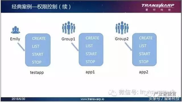 第一个是有关于权限控制。团队来了新人,想基于生产集群的数据额外开发一些新的功能,这时候就需要比较高效的开发。或者现在有用户想查看某些信息,但是一些敏感信息只有管理员才能看到。另外,公司里的多租户环境中,多个租户同时在同一台机器上运行程序,不会相互干扰。对于以上问题,我们抽象出了一个Application的概念,例如图中这个新用户叫做Emily,刚进公司把她归在一个testapp里面,你可以赋予她各种权限。比如她有权利在testapp里创建流应用,她有权利去看当前正在运行的分析系统,她有权利去启动一些以前存储过的存储过程。类似的,公司里可能还有一群人group1,对应他们有一个应用叫app1。如果现在Emily想去看group1的app1里的东西,不给她赋予一个特殊的权限,她是没办法看到的,所以我们就做到了一个这样的隔离。