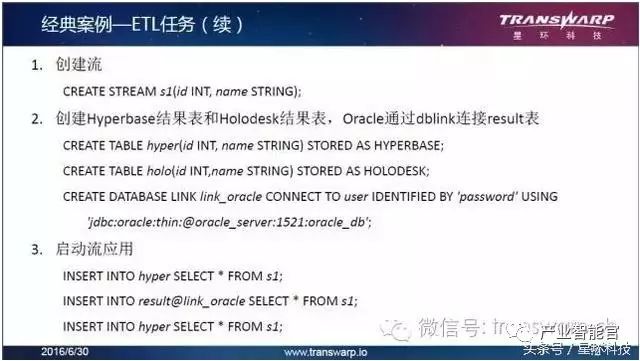 接下来就是实现过程。首先创建流,然后创建几张表如图,最后启动流的时候只需要图中这几行SQL,你的ETL就完成了。其实就是需要这样几行SQL就可以实现流应用,当然,一开始你也可以加入聚合、复杂计算等,但是这也只是一个SQL的复杂化问题。