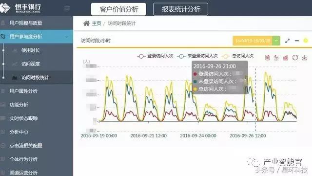 该功能呈现选定时间段内的登录客户、匿名客户、客户整体访问时段分布情况。如果按小时统计,通过分析可以明显看出每天都会呈现三个客户活跃高峰,分别对应早、中、晚的某个特定时段,其中每天早间时段客户最为活跃。如果按天观察,可以看出,周一、周二客户最为活跃,周六、周日客户最为不活跃。基于此,我们可以让业务更好的制定或优化营销策略,例如加大周一、周二早间时段的渠道营销力度,可能会获得更佳营销效果。