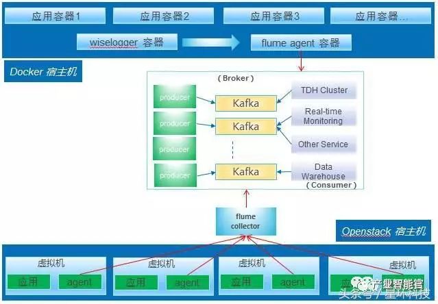 在日志收集流程方面,针对不同云环境设计了不同的采集流程,对于部署在openstack云环境和部分物理机上的应用,通过在应用服务器直接部署flume agent实时采集每个节点配置的日志文件、syslog、进程状态信息,实时发送后端的flume 服务端,服务端完成原始数据入库和初步的过滤解析并发送到kafka消息中间件;对于部署在docker容器环境下应用,因为已经做了日志规范化,宿主机上的flume直接利用宿主机提供的接口读取对应镜像所属路径下的日志文件,直接发送到kafka消息中间件。