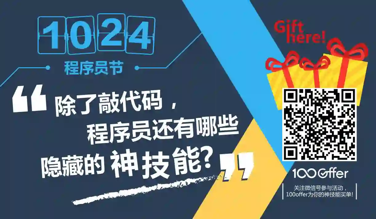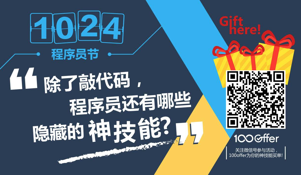 1024程序员节这天,100offer给你一个撕掉标签的机会:关注100offer微信号,发送一段话/一张图/一段视频/一条语音…展示你除了敲代码以外的神技能,还有最高价值1024元的“程序员兴趣基金”等你拿!
