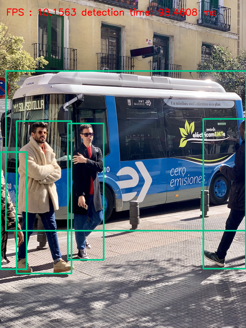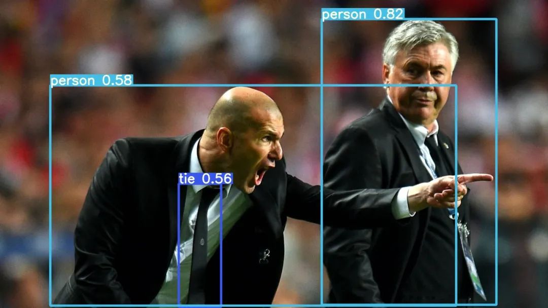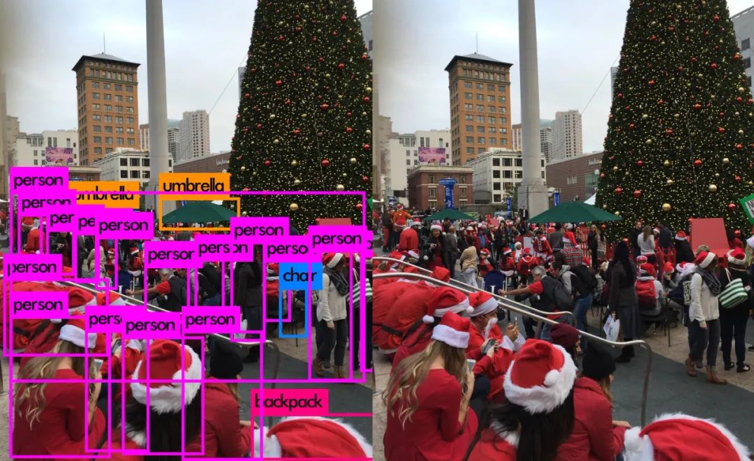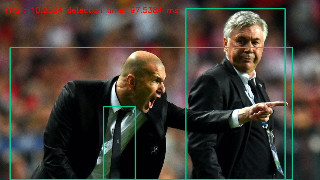 由于在导出的时候ONNX格式文件时模型的推理得到的三个输出层原始结果,所以还需要对每个数据先完成sigmoid归一化,然后再计算相关值,这部分的代码实现我参考了项目中的yolo.py中的Detection部分,得到初始每个对象的检测框之后,采用OpenVINO中自带非最大抑制函数,完成非最大抑制,就得到了最终的预测框,然后绘制显示。
