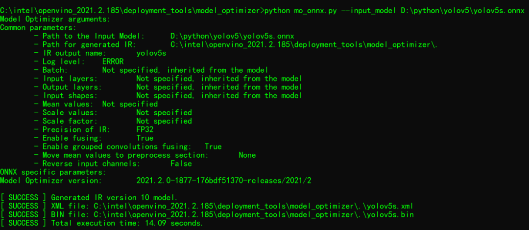 模型转换主要是把原始的YOLOv5的pytorch模型文件转换为通用的开放模型格式ONNX与OpenVIN特有的文件格式IR(*.xml与*.bin)。