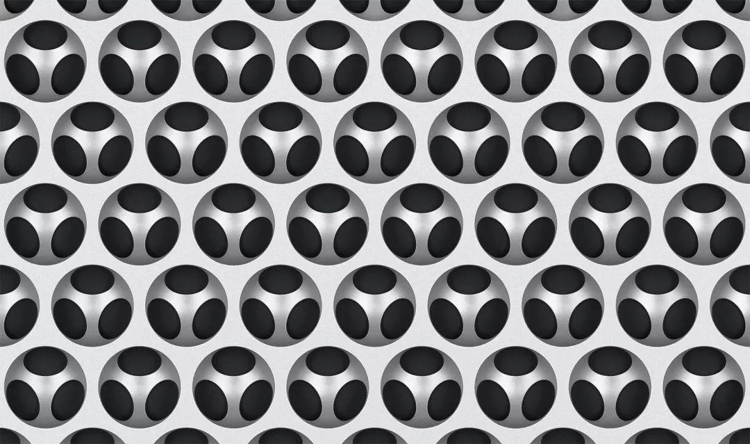 除了内部散热结构的设计以外,Mac Pro 和 Pro Display XDR 那标志性的圆孔网格样式也有利于帮助机器内热量散发(小声bb:真的不是对密恐患者的恶意吗),这种网格样式是根据分子晶体结构的自然状态设计的。三维联锁球面网格增大了表面积,从而提升了通风性能和结构强度。