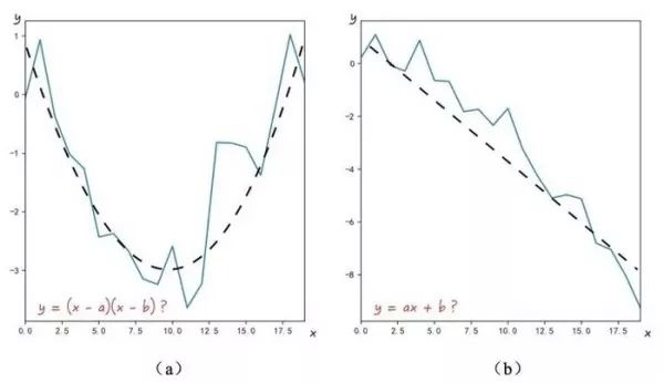 当得到如图5所示的两组数据时,我们应该如何用模型去描述数据的变化规律呢?对于图5a,数据的图形有点像抛物线,因此选择二次多项式拟合是一个比较合理的选择。于是假设模型的形式为y=(x-a)(x-b)。然后使用数据去估计模型中的未知参数a,b。得到的结果还不错,模型的预测值与真实值的差异并不大。