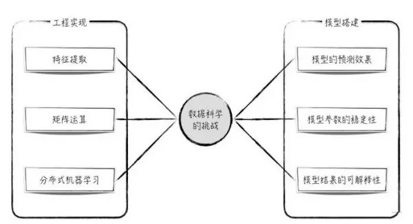 在数据科学实践中,我们将使用较为复杂的机器学习或统计模型对数据做精细化的分析和预测。这在工程实现和模型搭建两方面都提出了挑战,如图2所示。