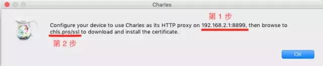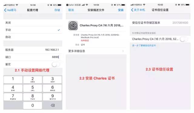 2.2、安装 Charles 证书。打开 Safari 浏览器,输入如上图 "两步操作" 的第 2 步地址。按提示安装 Charles 证书。