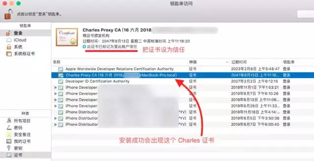 2、Charles 证书的信任。先打开钥匙串,看看是否安装成功了没。成功了,双击该证书,点击 "信任",展开后出现如下,选择:始终信任。