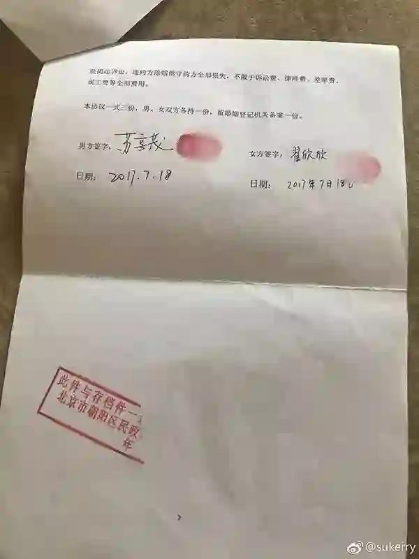 网传苏享茂和翟某欣的离婚协议书。 微博@sukerry 图
