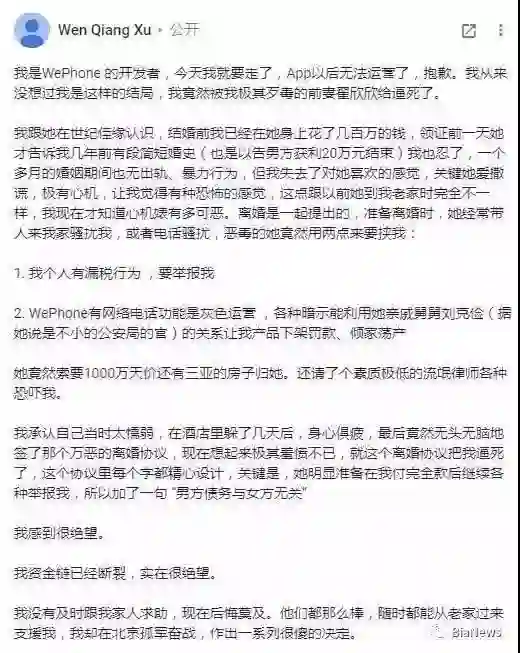 前一天,他在自己的社交账号上写道:“我是WePhone的开发者,今天我就要走了,App以后无法运营了,抱歉。我从来没想过我是这样的结局,我竟然被我极其歹毒的前妻翟某欣给逼死了。”