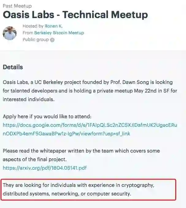 而在今年5月,Oasis曾举行过一场技术性的线下私密聚会,聚会的Co-organizer,Ronen同为宋晓东的Blockchain Lab成员。从报名者的反馈看,Oasis对此次活动进行了严格的筛选和保密措施,我们不妨猜测Oasis此举是在为其Ekiden项目施行「招兵买马」计划。不过,由于现有资料有限,Oasis Labs其他项目成员和规模信息暂未可知。