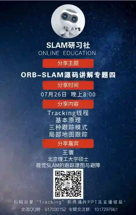 计算机视觉life的小伙伴们大家好,继上周的初始化源码后,趁热打铁,研习社为大家准备了源码讲解专题的第四讲:ORBSLAM2 单目Tracking线程源码讲解,包括Tracking的基本原理、三种跟踪模式和局部地图跟踪等知识,敬请期待!