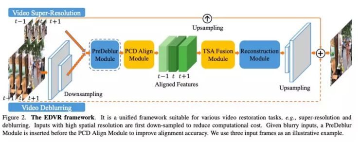 在论文《EDVR: Video Restoration with Enhanced Deformable Convolutional Networks》中,作者介绍了这种新型算法,通过一种新的网络模块 PCD 对齐模块,使用 Deformable 卷积进行视频的对齐,可以实现整个过程端到端的训练;而在挖掘时域(视频前后帧)和空域(同一帧内部)的信息融合时,作者又提出了一种时空注意力模型,来进行更好的信息融合。