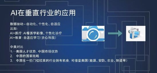 第三点,中国其实在一些门槛比较高的行业,我觉得有 AI 的应用的机会,比如说像能源、安防、农业、制造等等。这些行业往往资源相对垄断一点,但是现在因为国家战略之后,这些行业也都在寻求 AI 化,而且我觉得 AI 化在这些行业肯定是个必然,你不去做,往往就失去了这种转型的机会了。因为这些行业门槛比较高,资源相对垄断,所以创业公司可能进入的周期会长一点,不是说那么容易获得数据并且做起来的,但是我觉得有很大的机会。这方面我觉得可以借鉴美国,因为美国一方面在这些领域相对比中国来说更加市场化,比如说在能源,在农业制造等等方面,甚至安防你可以看到美国有很多不错的 AI 公司,我觉得中国可以在这方面多借鉴,大家如果对这些特定领域很感兴趣,我们也可以有机会多交流。
