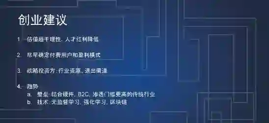 第四个建议,是把握 AI 发展的趋势。作为投资人,我分享几个我看到的未来 1-2 年的趋势。从壁垒上说,AI 创业公司正在通过以下三个方式提升壁垒,包括 1)结合硬件(关注一下 CES) 2)B2C 的商业模式(可以形成独有的数据壁垒)3)渗透门槛更高的传统行业(如吴恩达创立的 AI+ 制造的公司 Landing.ai)。从技术上说,大部分 AI 创业公司采用监督学习算法比较多,无监督学习和强化学习应该还有很大的应用潜力,比如 2017 年 AlphaZero 的成功。另外,随着最近区块链成为风口,AI 和区块链的应用也备受关注。区块链在解决数据安全和共享方面,和 AI 有着很好的结合点,相信会产生不少有价值的应用场景。