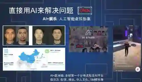 ObEN 的整个发展它也很快,除了和 SM 合作,比如说在中国它现在就在跟 SNH48 在合作。其他地方也有很多应用,包括它和微信等等这些企业也有合作。所以 ObEN 也是我讲的一家 AI 在垂直行业的应用公司,它在娱乐行业来进行运用,也是用 AI 来直接解决这个问题的。并且现在 ObEN,它在布局整个区块链,它推出了全球第一个分布式的社交 AI 的平台,结合了区块链。