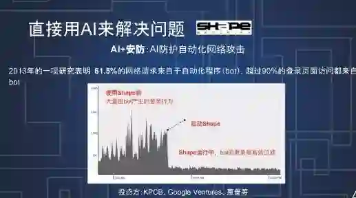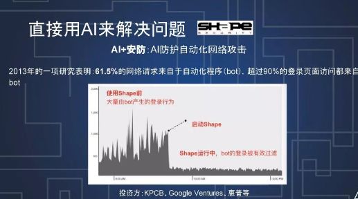 Shape 的客户是谁呢?比如就是淘宝,Shape 的目的是帮助淘宝去分析出来登录我淘宝这些人到底是人还是 Bot。如果是 Bot,就要把它给阻拦掉,这个 Shape 也发展的非常快,它也基本上就是要达到这个独角兽的行列了,它的投资方也都是美国顶级的 VC,像 KPCB,Google,Ventures 等等,这张图是 Shape 的一个很好的体现。