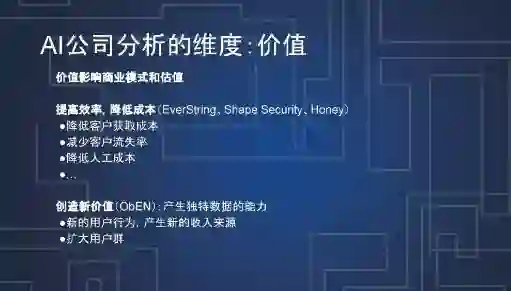 就是 AI 在这个里面到底扮演的是什么样的价值,这个问题很重要,因为它影响到了这个公司的商业模式和估值。当然从投资角度来说,投资就是尤其我们这种早期投资就是价值投资,你有足够的价值才值得投资,才能让我们看到未来增长的潜力。那 AI 在这些很多公司当中这个价值主要体现在两个层面: