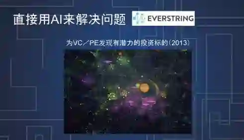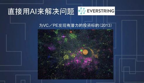 因为 EverString 这些人大都是斯坦福出来的,他们最早做的事情是帮助 VC 和 PE 来发现有潜力的投资标的,也就是在 2013 年干的事情,现在大家看到的这张图,实际上是他把全球的很多公司的信息做了整合之后,通过可视化的方式呈现在一张图上,来帮助 VC 和 PE 发现很有价值的这些标的,比如图上的圈,比较大的这些圆圈可能代表的就是公司体量比较大,增长速度比较快的这些公司。