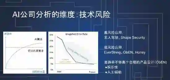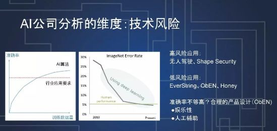那么前面我讲到的这个概念可以从一个方面来讲,就是在应用当中它其实是有风险差异的,有些叫高风险应用,比如说无人驾驶、比如说 Shape Security 做安防的,安防的这个要求很高的,别人用了你的系统万一出了问题损失会很大;有些是低风险应用,比如说 Ever String 给你推荐企业客户这一类的,推荐错了问题也不是那么大,无非就浪费了你一些销售的资源;ObEN 做娱乐的,你说它声音不是那么逼真可能风险也不大;Honey 也是,它给你做智能的消费,给你推荐了一些商品不是那么准确,也还好,它至少不是一个高风险应用。我们一定要去想明白,我们的应用是什么类型的。