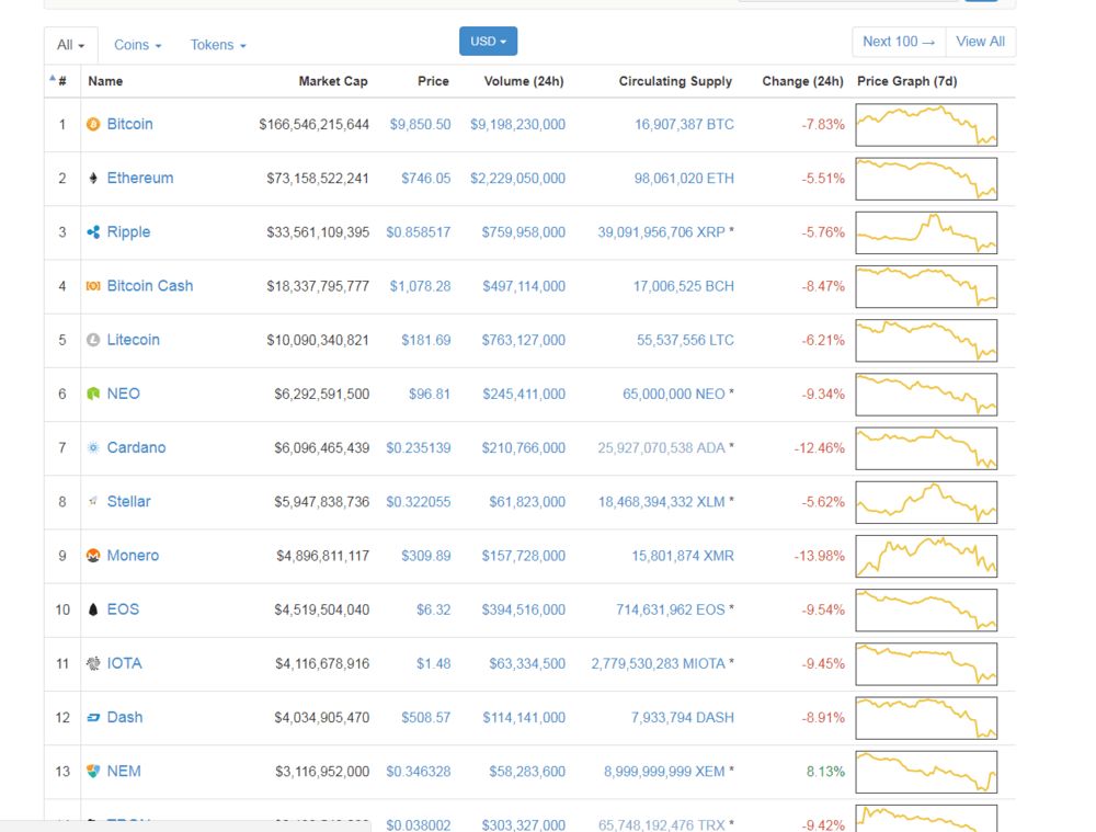 根据CoinMarketCap数据,过去24小时内比特币价格下跌7.8%至9850美元,以太币下跌5.5%,瑞波币下跌5.7%,莱特币下跌6.2%。据CNBC报道,周四日本金融服务局向7个虚拟货币交易所下达“惩罚警告”,并暂停了两所交易所的运营一个月。