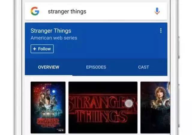 而Google不仅会根据用户的搜索记录提供相应的资讯,在用户进行搜索时,Google还会在搜索结果中会提示相应可供关注的主题,例如电视剧《Stranger Things》,Google会把这部电视剧的新进展、新消息推送给你。可以说GoogleFeed真正做到了将推荐和搜索有机的结合在了一起。