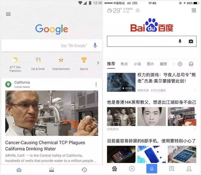 几乎在同一时刻,百度和Google两大搜索巨头都对他们的搜索App进行了改版。手机百度9.0将导航页和底部菜单都进行了彻底调整,让整个手机百度基本变成了一个新闻客户端。而Google搜索App则在经典的搜索框下面同样也加了一个新闻信息流的功能Feed。