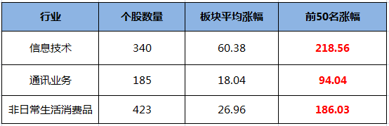 从板块平均涨幅看,涨幅最大的是信息技术,达到60.38%。其余两个板块涨幅一般,还跑输大盘。