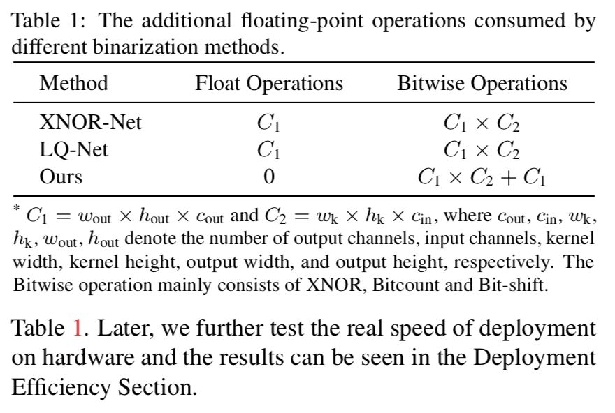 由于 Libra-PB 应用于权重,因此在 IR-Net 中有额外的二值化激活操作。在 Libra-PB 中,与使用浮点标量(例如 XNOR-Net 和 LQ-Net)的现有解相比,使用新的位移标量可以降低计算成本,如表 1 中所示。稍后,我们将进一步测试在硬件上部署的实际速度,结果可以在部署效率部分看到。