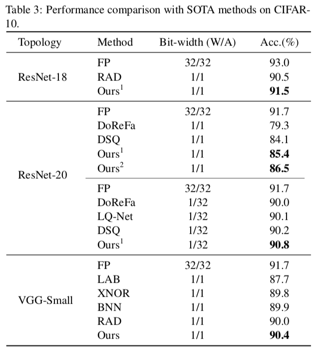表 3 列出了在 CIFAR-10 上使用不同方法的性能,包括 ResNet-18 上的 RAD、DoReFa-Net、LQ-Net、ResNet-20 上的 DSQ、BNN、LAB、RAD、XNOR-Net 在 VGG-Small 上。在任何情况下,我们的 IR-Net 都能获得最佳性能。更重要的是,我们的方法在使用 1 位权重和 1 位激活(1W/1A)时,无论是使用原始 ResNet 结构还是使用 Bi Real 结构,都比 SOTA 方法有显著的改进。例如,在 1W/1A 比特宽度设置中,与 ResNet-20 上的 SOTA 相比,绝对精度提高高达 2.4%,与对应全精度(FP)模型的差距降低到 4.3%。