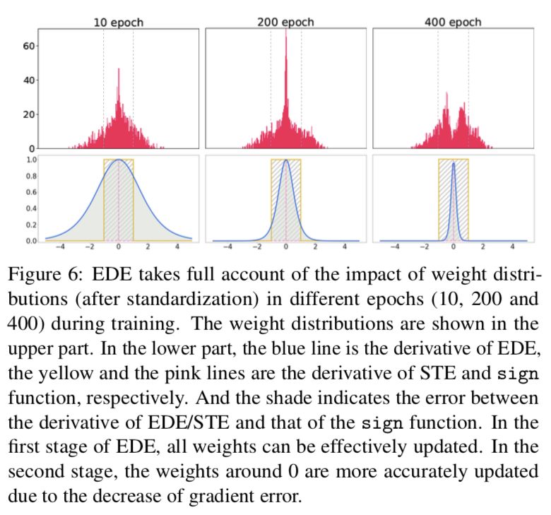 为了证明我们 EDE 的必要性和效果,我们展示了不同训练阶段的权重数据分布,如图 6 所示。第一行的图形显示分布,第二行的图形显示相应的导数曲线。在导数曲线中,蓝色代表 EDE,黄色表示普通的 STE(带截断)。可以看出,在 EDE 的第一阶段(图 6 中的 epoch 10 到 epoch 200),有很多数据在范围 [-1,+1] 之外,因此不应该有太多对更新能力有害的截断。此外,在训练开始时,权重分布的峰值很高,大量的数据聚集在零左右。在这个阶段,EDE 保持了与 Identity 函数相似的导数,以保证零附近的导数不太大,从而避免了训练的严重不稳定性。幸运的是,随着二值化引入训练,在训练的后期,权重将逐渐接近-1/+1。因此,我们可以缓慢地增加导数的值,并近似一个标准 sign 函数来减少梯度失配。可视化结果表明,我们的反向传播 EDE 近似与实际数据分布一致,这是提高精度的关键。