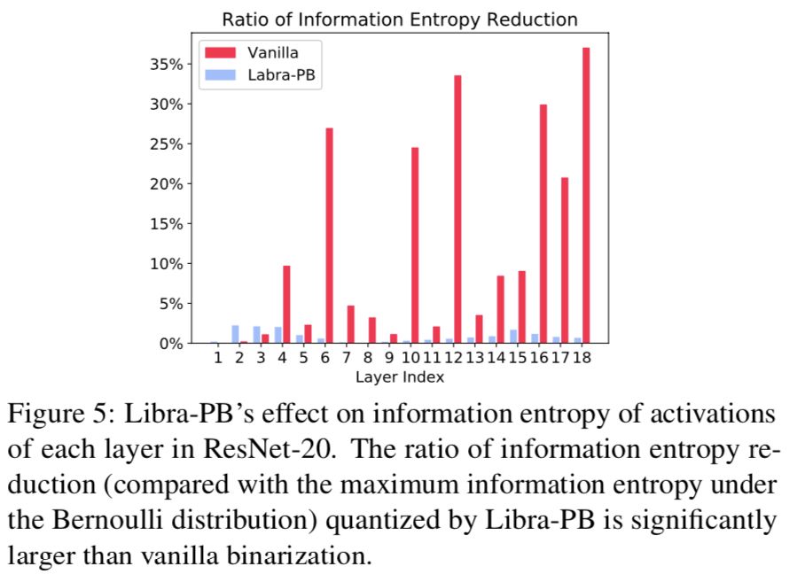 我们的 Libra-PB 可以通过调整网络中的权值分布来最大化 IR-Net 中二元权值和二元激活的信息熵。由于在二值化之前使用了显式的平衡运算,因此网络中每一层的二值权重具有最大的信息熵。受二元权重影响,IR-Net 中的二元激活也具有最大信息熵。为了证明 Libra-PB 在 IR-Net 中的信息保留,在图 5 中,我们展示了通过单普通二值化和 Libra-PB 量化的网络中每一层二进制激活的信息损失。普通的二值化使二值激活的信息熵大大降低。在 Libra-PB 量化的网络中,在 Bernoulli 分布下,每一层的激活都接近最大信息熵。而在前向传播中,一般的二值化引起的二值激活的信息损失是逐层累积的。幸运的是,图 5 中的结果显示 Libra PB 可以在每一层的二进制激活中保留信息。