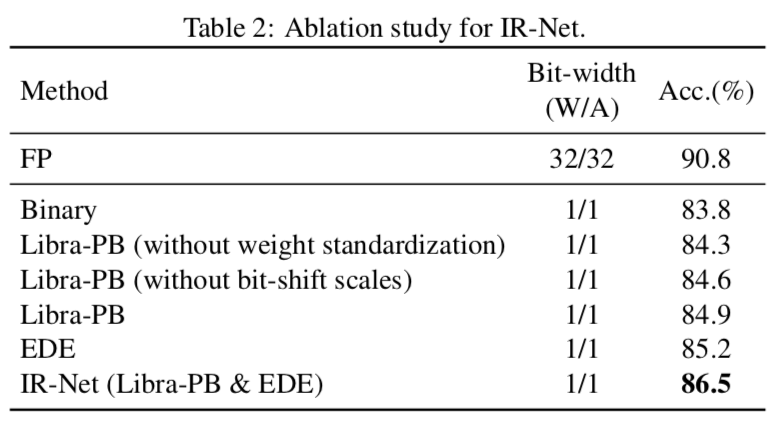 我们在 CIFAR-10 上使用 ResNet-20 模型进一步研究了 IR-NET 的不同部分的性能,这有助于理解我们的 IR-NET 在实际中是如何工作的。表 2 显示了不同设置下的性能。从表中可以看出,单独使用 Libra-PB 或 EDE 可以提高精度,而权重标准化在 Libra-PB 中也起着重要作用。此外,这些部分带来的提升可以叠加在一起,这就是为什么我们的方法可以训练高精度的二值化模型。