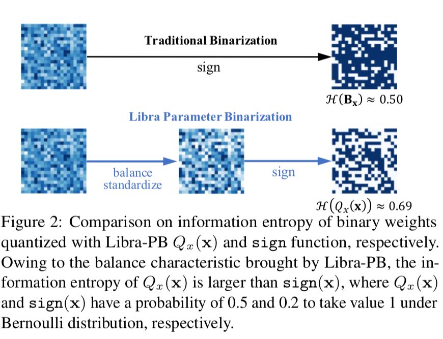 在此之前,绝大多数网络二值化方法试图减小二值化操作量化误差。然而,仅通过最小化量化误差来获得一个良好的二值化网络是不够的,也是困难的。因此,为了在前向传播中保留信息并最小化信息损失,我们提出了同时考虑量化误差和信息损失的 Libra 参数二值化(Libra-PB)。
